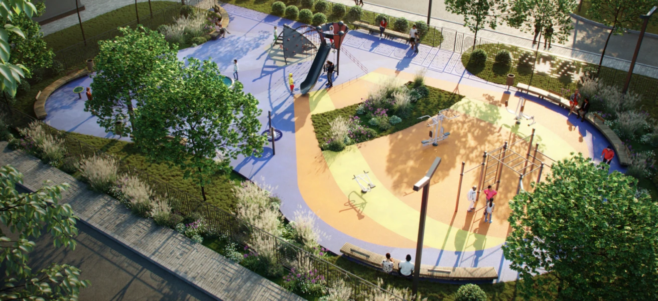 Магазины, пекарни и аптеки разместятся на первом этаже жилого комплекса. А пока взрослые совершают покупки, дети могут весело и с пользой провести время в безопасном дворе. Для самых маленьких жителей предусмотрена закрытая игровая площадка с мягким покрытием, а для тех, кто постарше, организована зона индивидуальных воркаут‐тренировок.