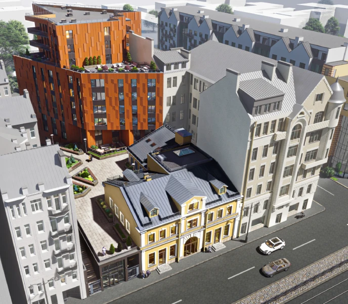 Проект объединяет в себе современную часть здания и исторический особняк Н. С. Рыжкина, фасад которого выходит на Лиговский проспект.