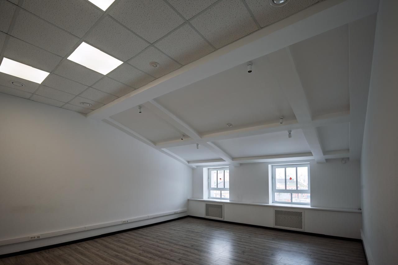 Пространства отличаются высокими потолками и большим количеством окон, обеспечивающих естественное освещение.