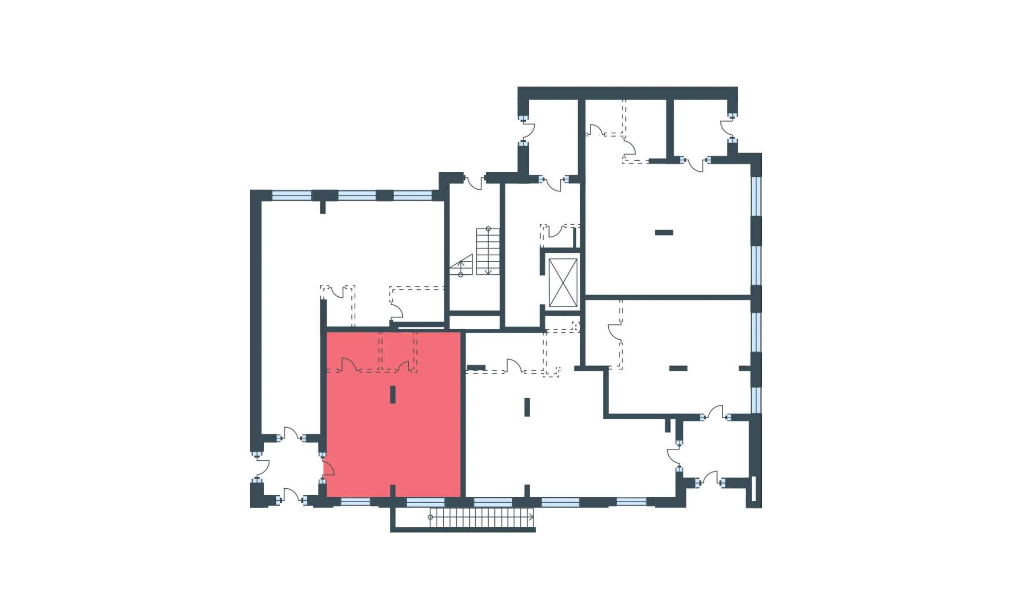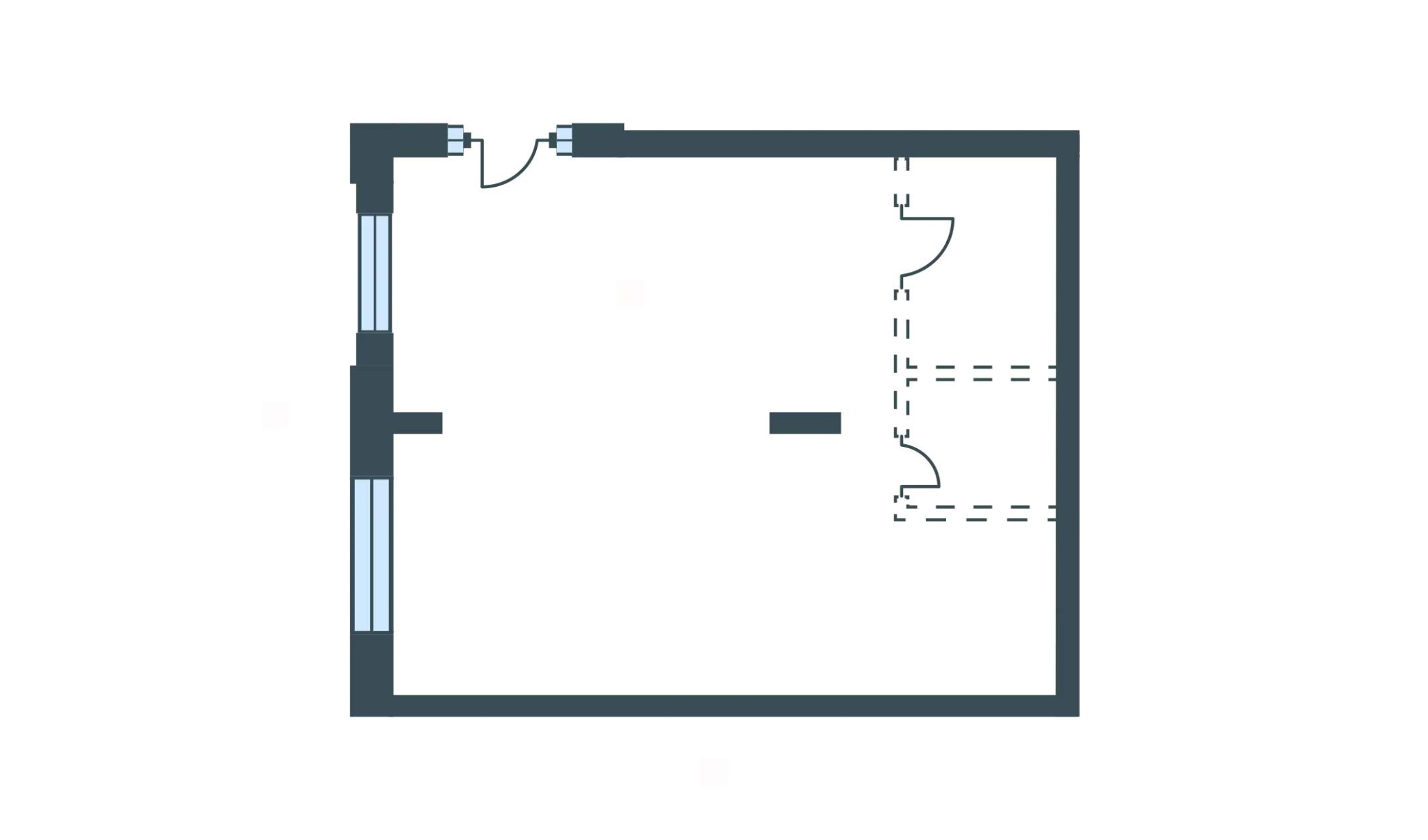 Помещение располагается вдоль коридорной линии. От коридорной линии арендатор самостоятельно изолирует площадь путем установки перегородок. Напольное покрытие арендатор также выбирает самостоятельно.