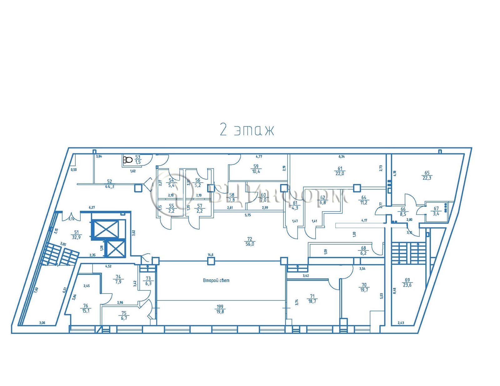 Кабинетная планировка: просторный холл (56 м.кв.), кабинеты, подсобные помещения, санузел.