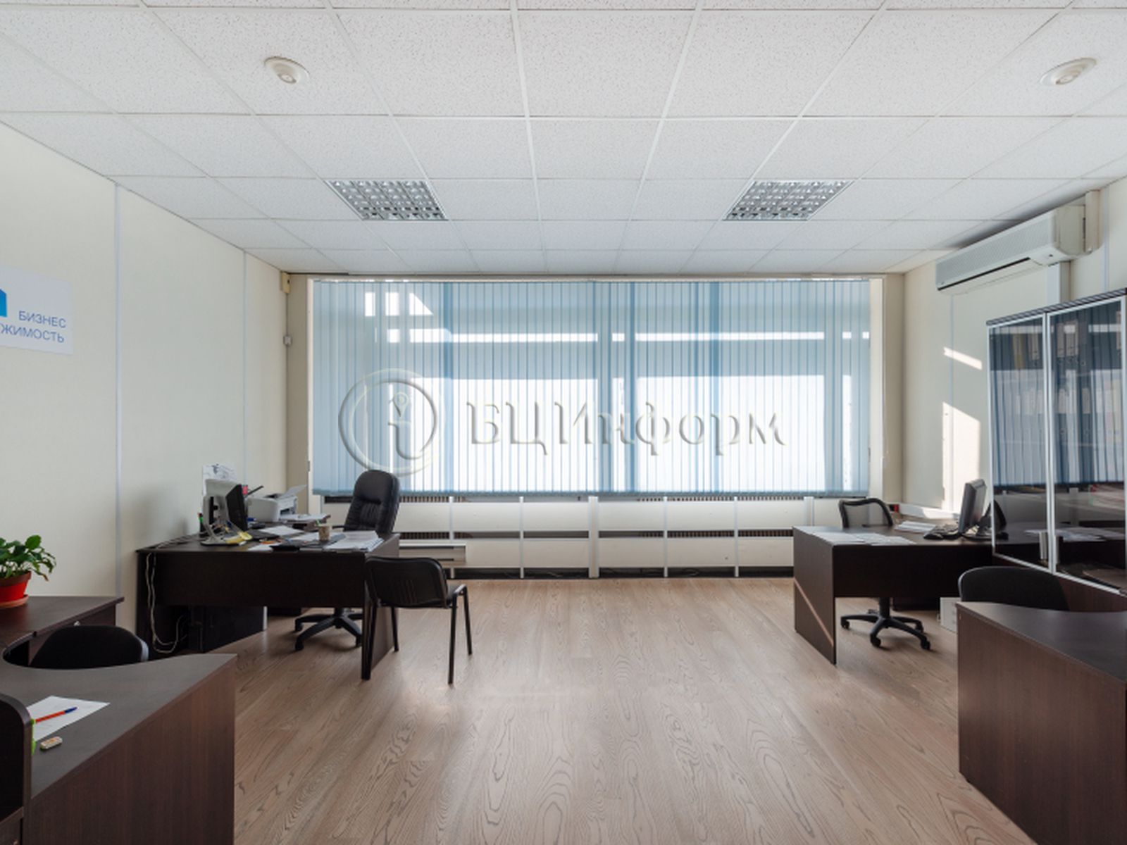 В хорошем состоянии. Стандартная офисная отделка. Стены - обои под покраску, подвесные потолки "Армстронг", напольное покрытие - ламинат.