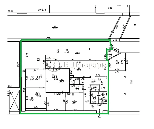 Смешанная планировка, семь комнат, подсобные помещения, санузел. Без окон.