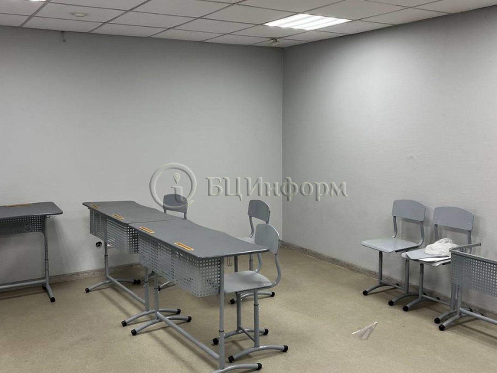Выполнена стандартная офисная отделка: стены - окрашенные обои, потолок подвесной типа "Армстронг", напольное покрытие - линолеум.