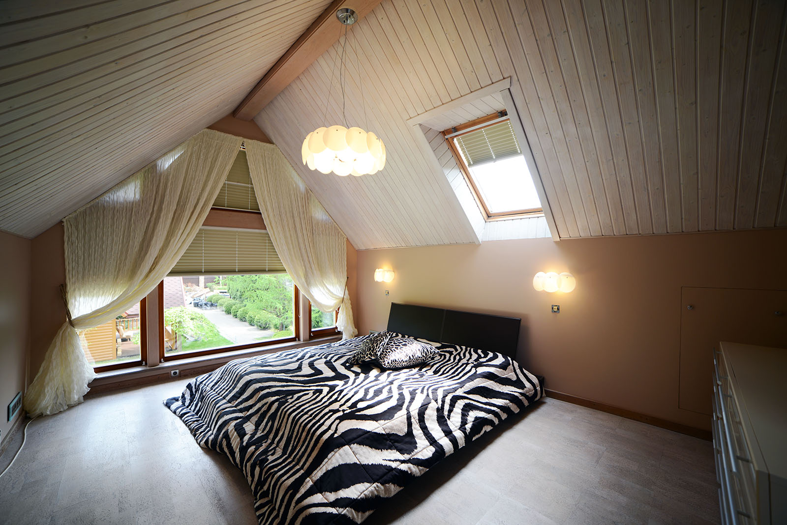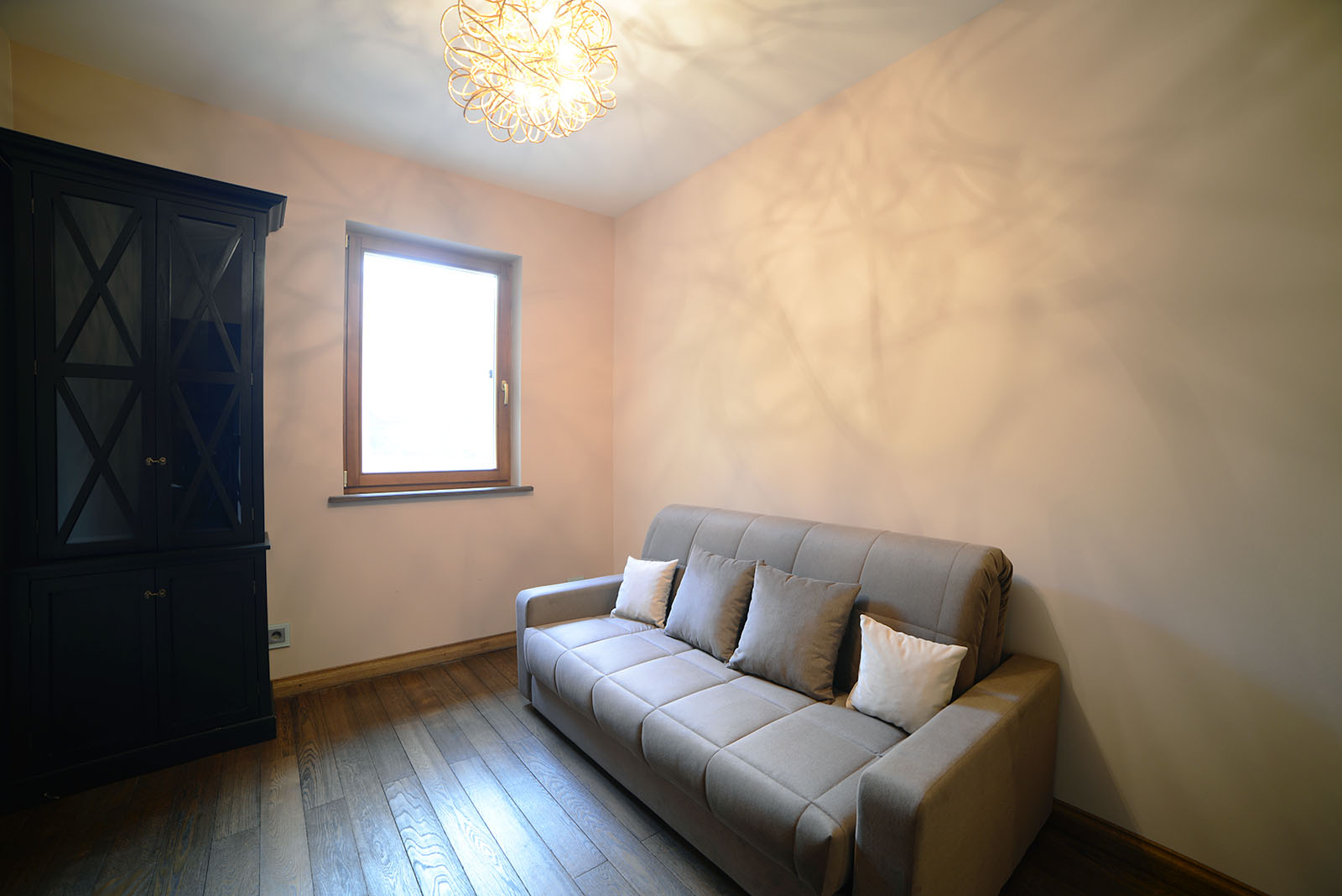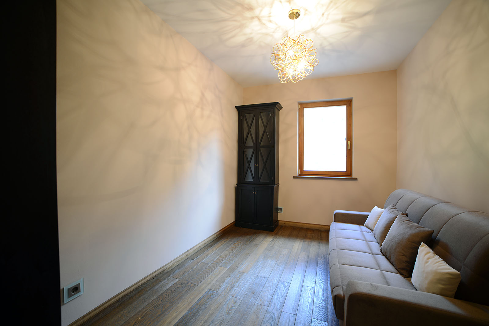 Просторная кухня-столовая со всей необходимой бытовой техникой и панорамными окнами, открывающими вид на насаждения изумрудно-зеленой туи. Залитая светом гостиная в светлых тонах – средоточие уюта, место семейных встреч и дружеских бесед. Спальня с двухместным диваном, которая может стать рабочим кабинетом, либо местом для отдыха, чтения или творчества. Вверх по винтовой лестнице под двускатной крышей расположилась спальня с окнами в пол, со своей особой атмосферой романтики, умиротворения и покоя. Этот дом станет для вас островком спокойствия и уюта в мире будничной суеты и повседневных забот.