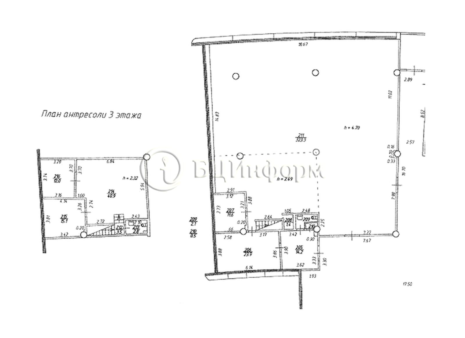 Высота потолка от 2.3 м (антресоль) до 6.7 м.