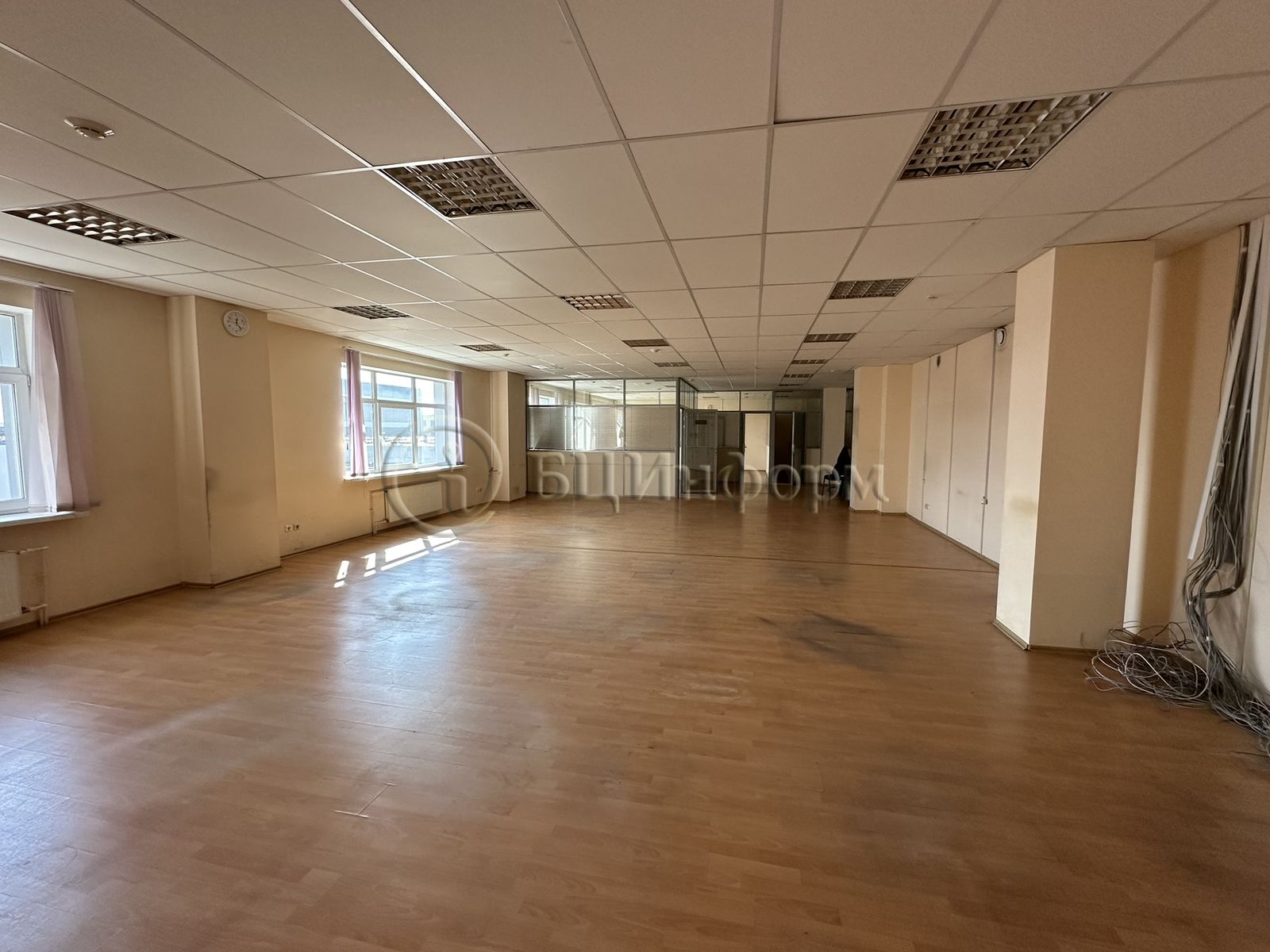 Состояние хорошее. Выполнена качественная отделка. Стены - обои под покраску, напольное покрытие - ламинат, подвесные потолки "Армстронг".