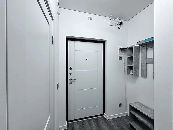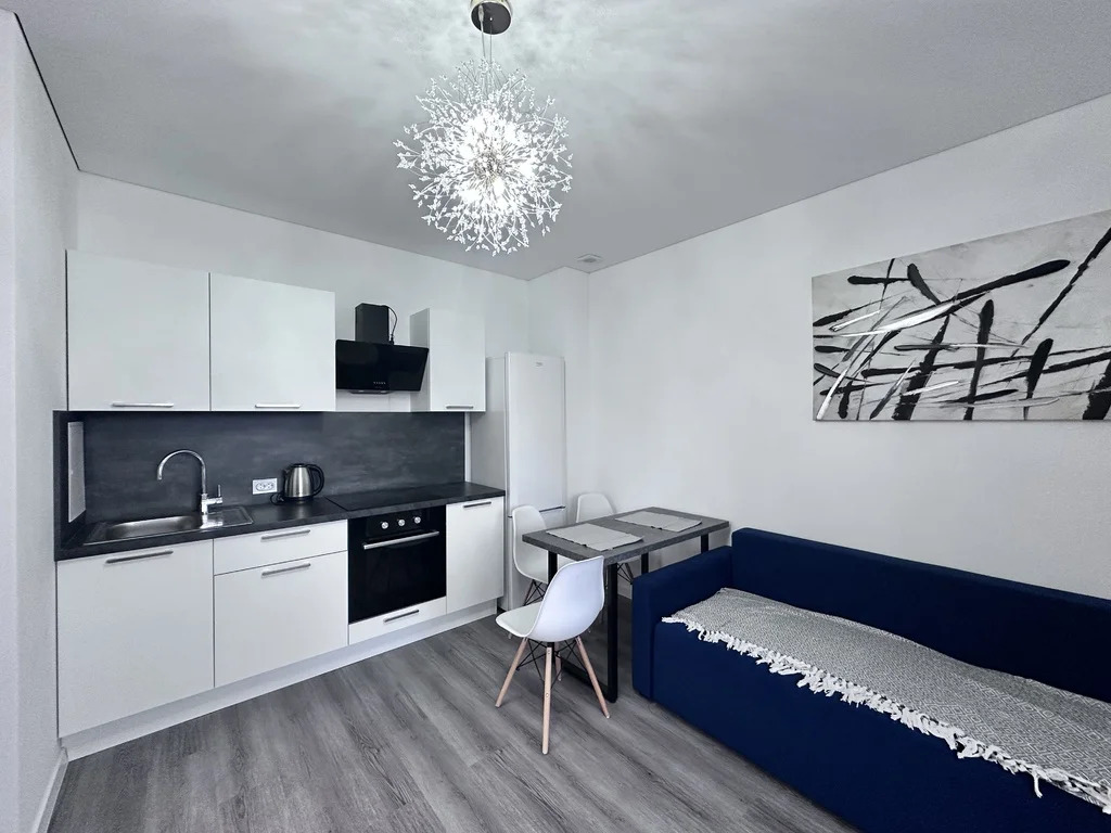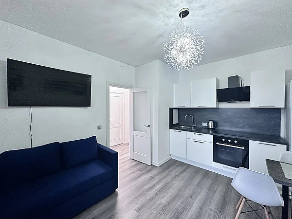 • Полный комплект бытовой техники: холодильник, духовой шкаф, плита, вытяжка, эл. чайник. Телевизор (диагональ 55) со смарт-ТВ Видеодомофон.