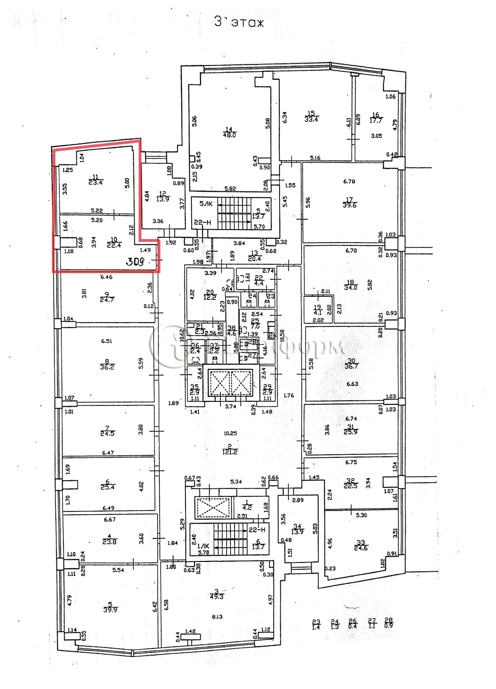 Кабинетная планировка. Состоит из двух смежных комнат (22.4 м.кв. + 23.4 м.кв.).