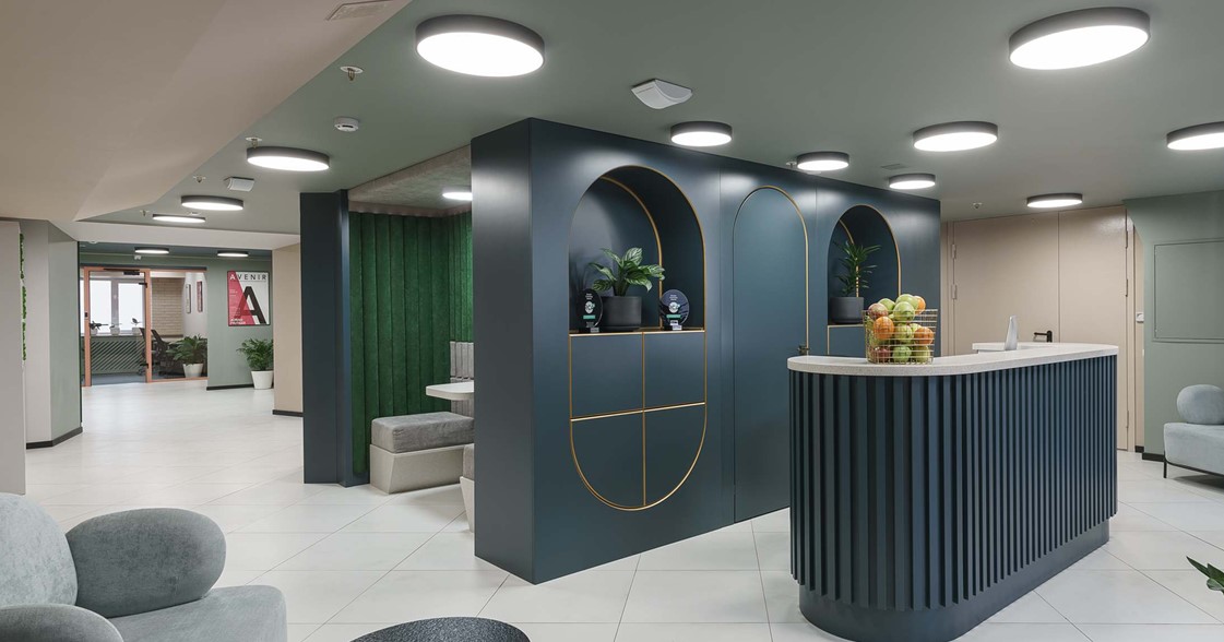 Есть оборудованная кухня, санузлы, переговорные комнаты, зона отдыха и ресепшн.
