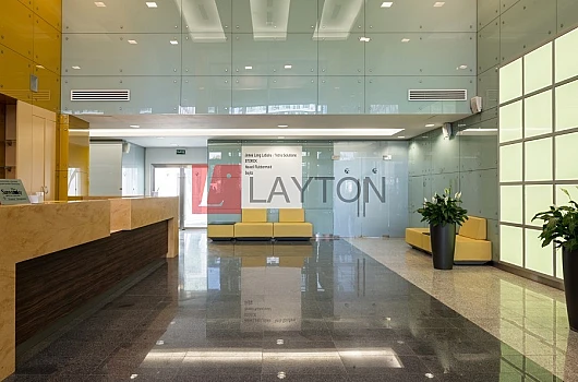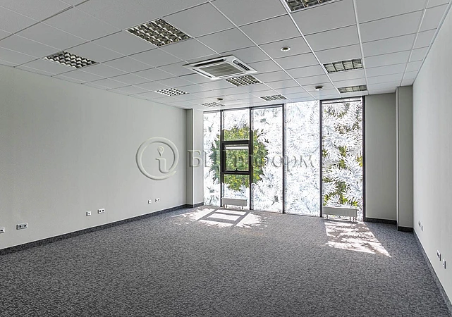 Просторный кабинет, открытой планировки. Есть подсобное помещение. Панорамное остекление.