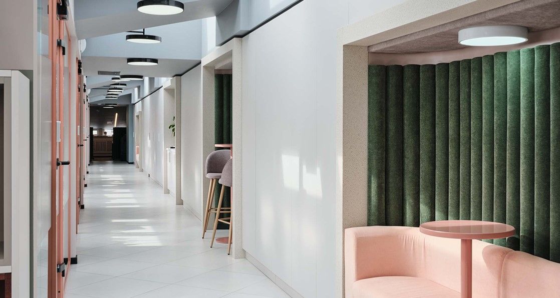 Есть оборудованная кухня, санузлы, переговорные комнаты, зона отдыха и ресепшн.
