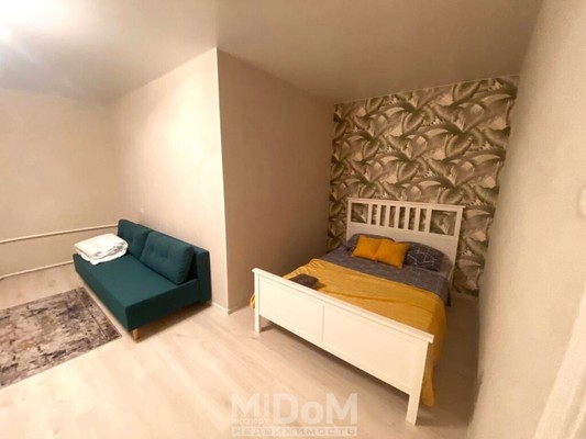 В гостиной диван, ТВ – зона, двуспальная кровать размещена в нише, что скрывает габариты массивной мебели .