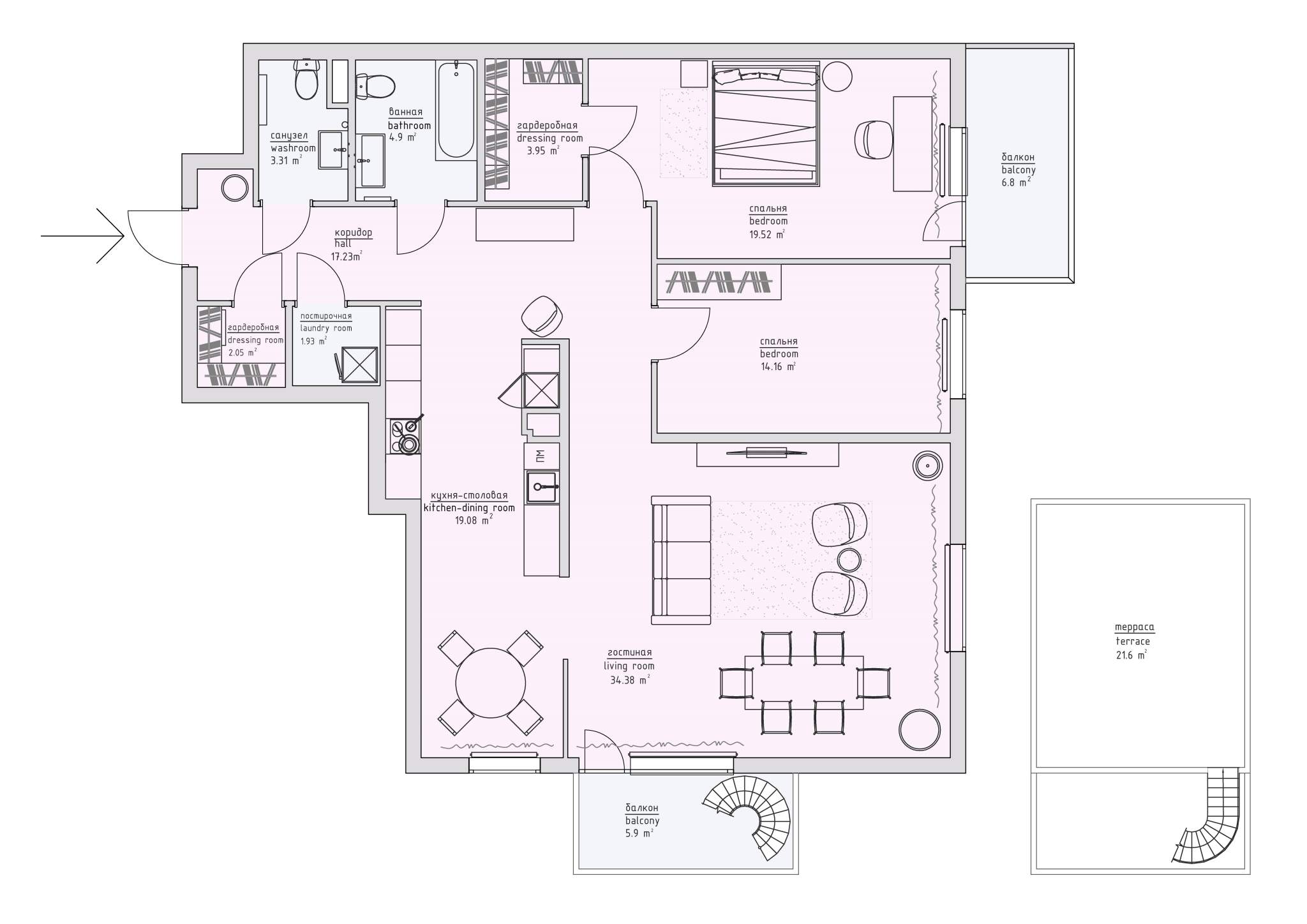 Дизайн-проект от Касабу. Квартира с европланировкой и своей закрытой террасой.
