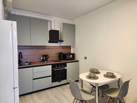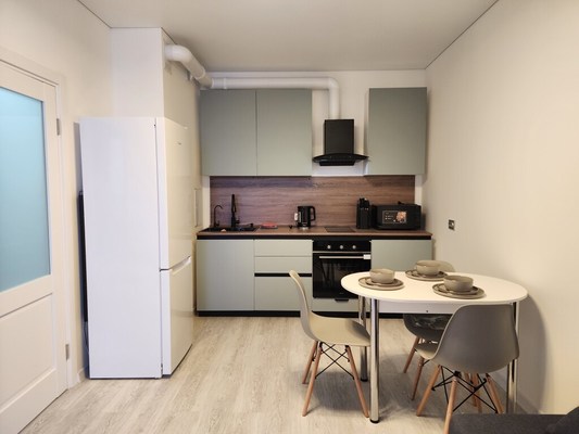 В кухне установлена новая современная техника: холодильник, элекрическая плитка на две конфорки, духовой шкаф, микроволновая печь, чайник, посуда для готовки и сервировки!