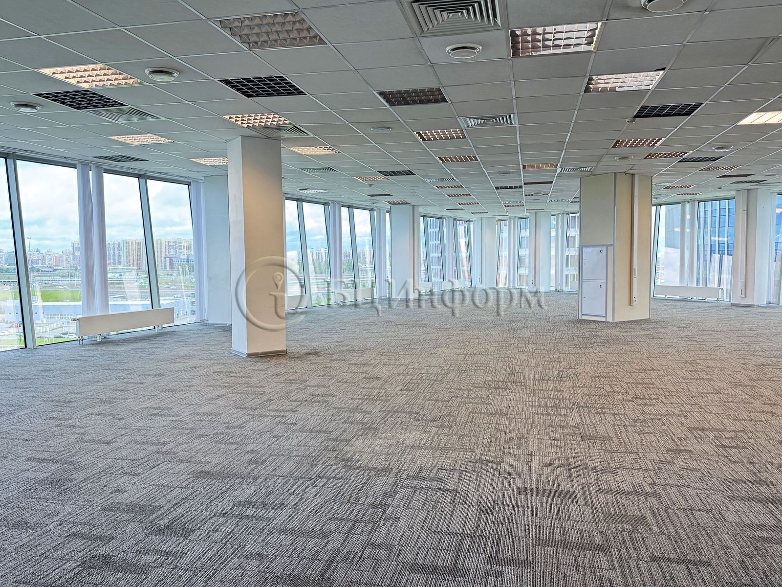Качественная офисная отделка, на полу ковролин, потолки типа "армстронг", большие витринные окна, светлые стены.