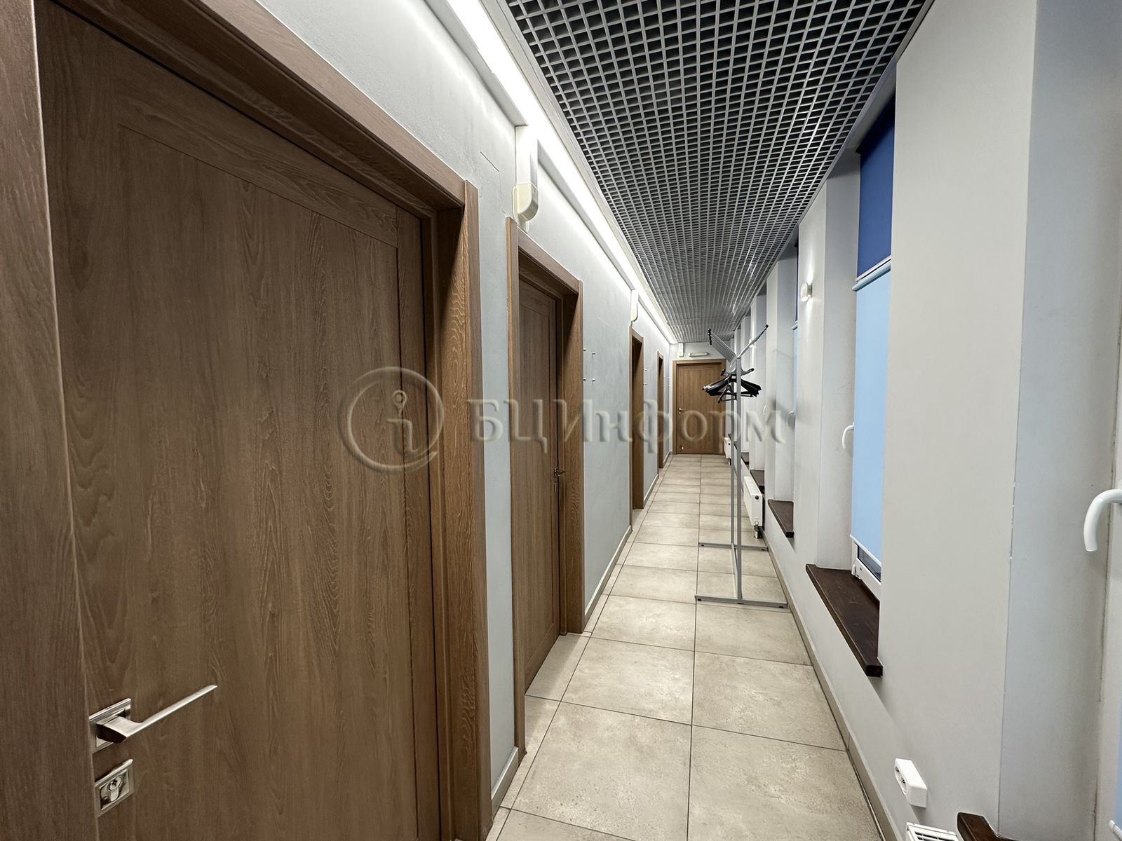 - Отделка: пол — керамогранит / ламинат, потолки — подвесные «Грильято», стены обои под окраску.