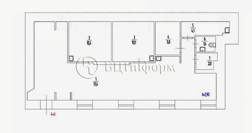 Кабинетная планировка из 4 комнат. Оснащено санузлом, мокрая точка.