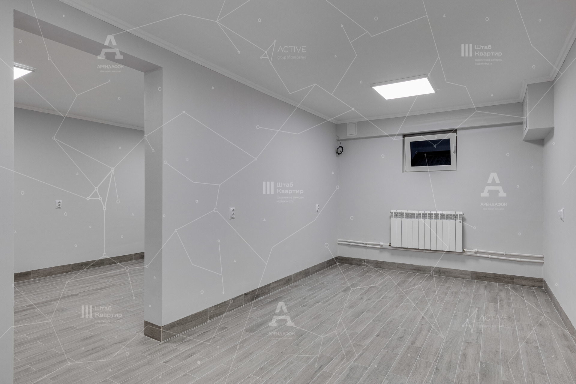 Планировка двухсторонняя, состоит из входной группы (ресепшн), санузла (с возможностью установки душа) и двух больших комнат.