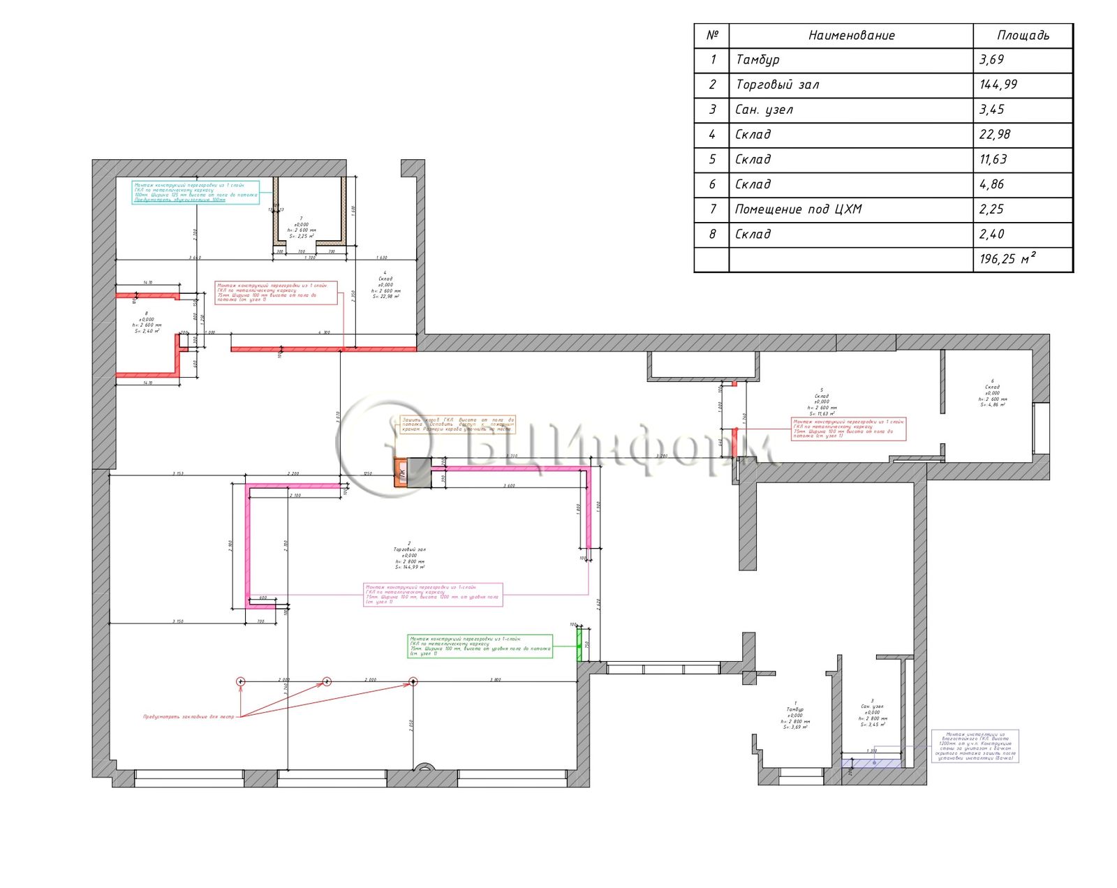 Смешанная планировка. Просторный зал ~ 144 м.кв., тамбур, подсобные помещения. Санузел.