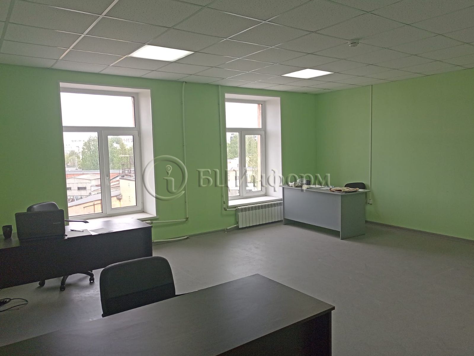 Оборудованное рабочее место расположено в просторном кабинете. В хорошем состоянии. Выполнена классическая отделка. Стены - под покраску, подвесные потолки "Армстронг". Напольное покрытие - линолеум.