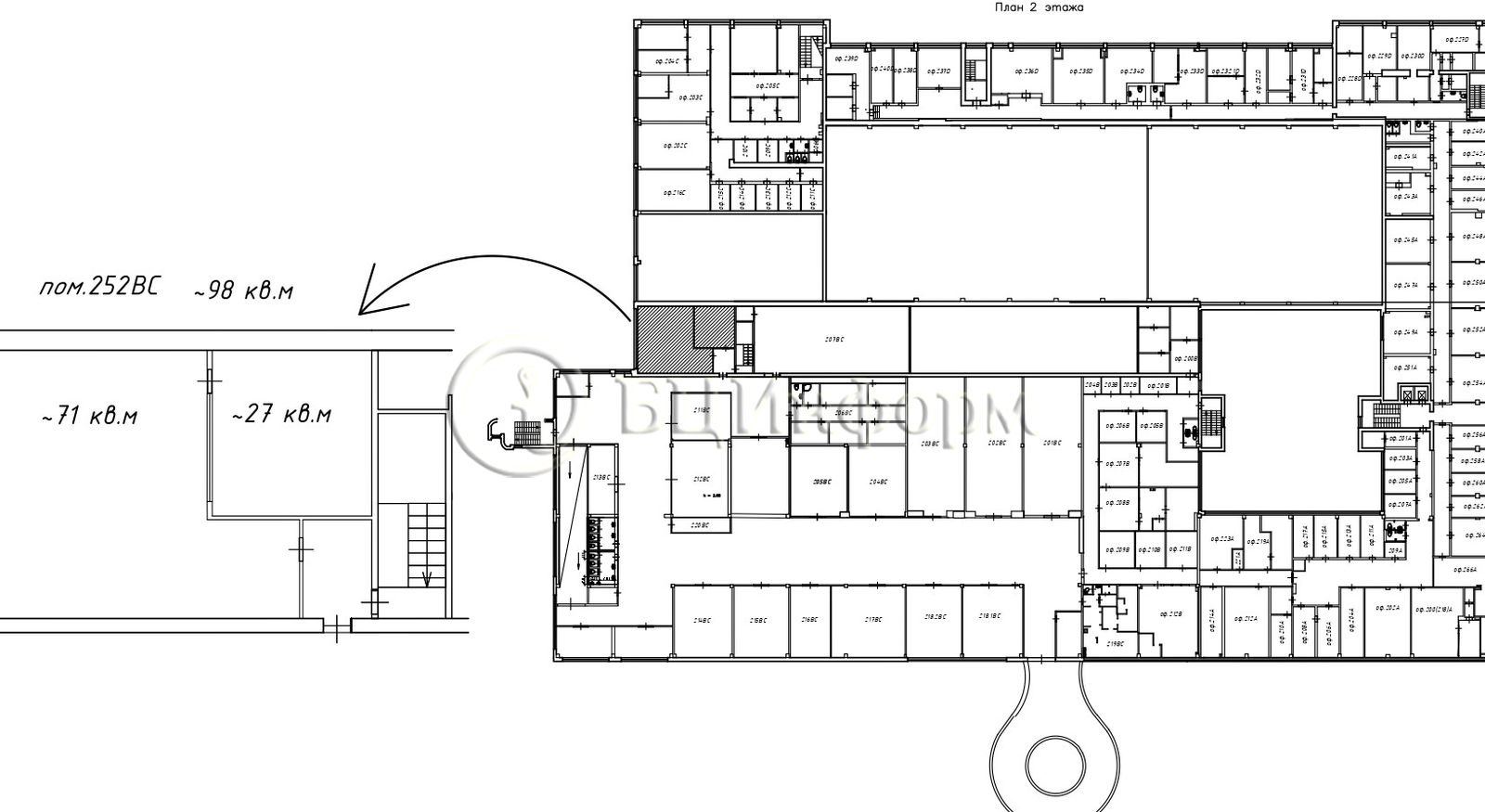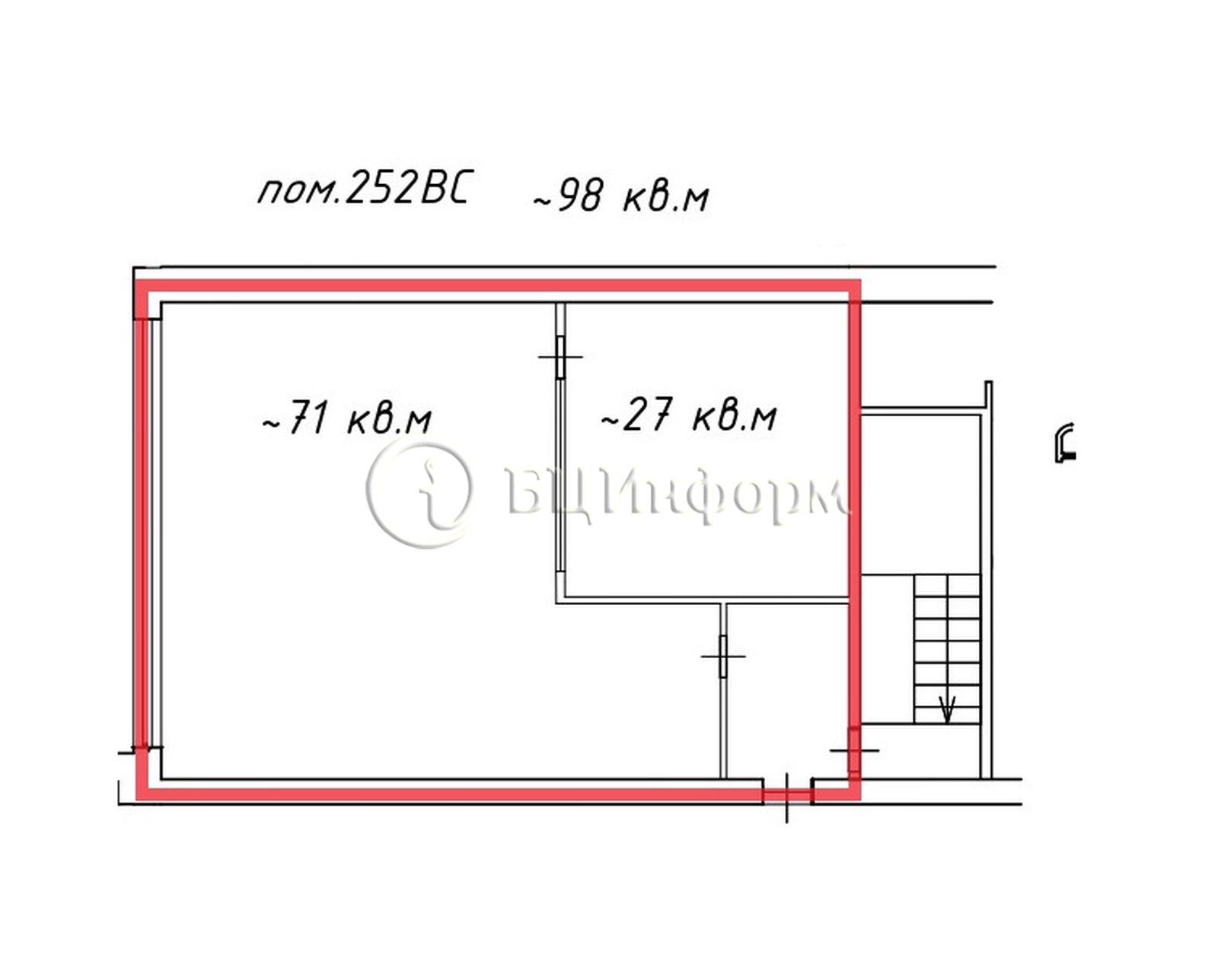 Помещение состоит из двух комнат (~71 м.кв. и 27 м.кв.).