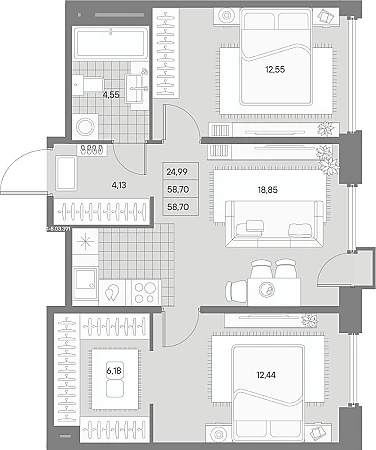Жилая площадь 24.99 м2, кухня 18.85 м2, черновая отделка.