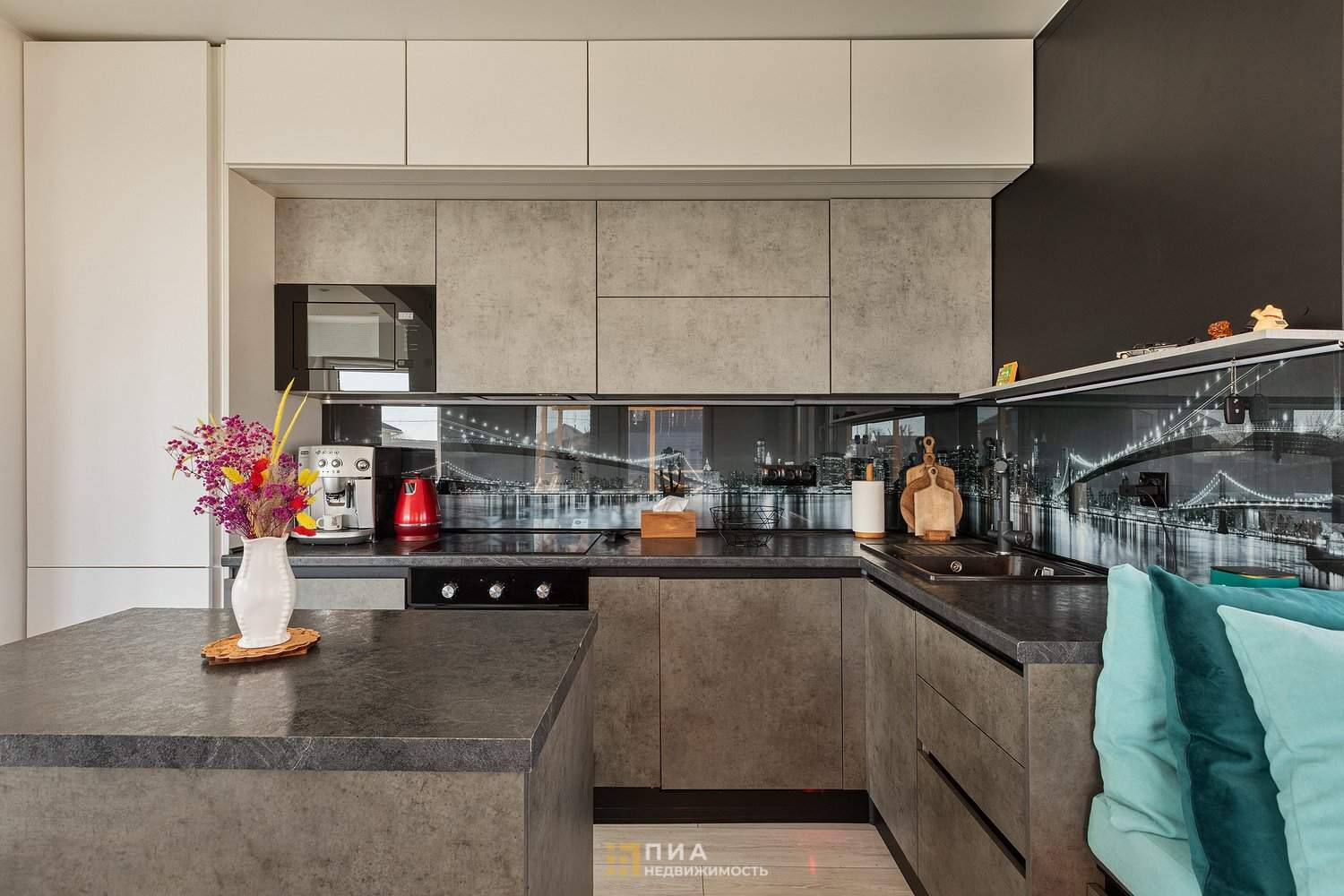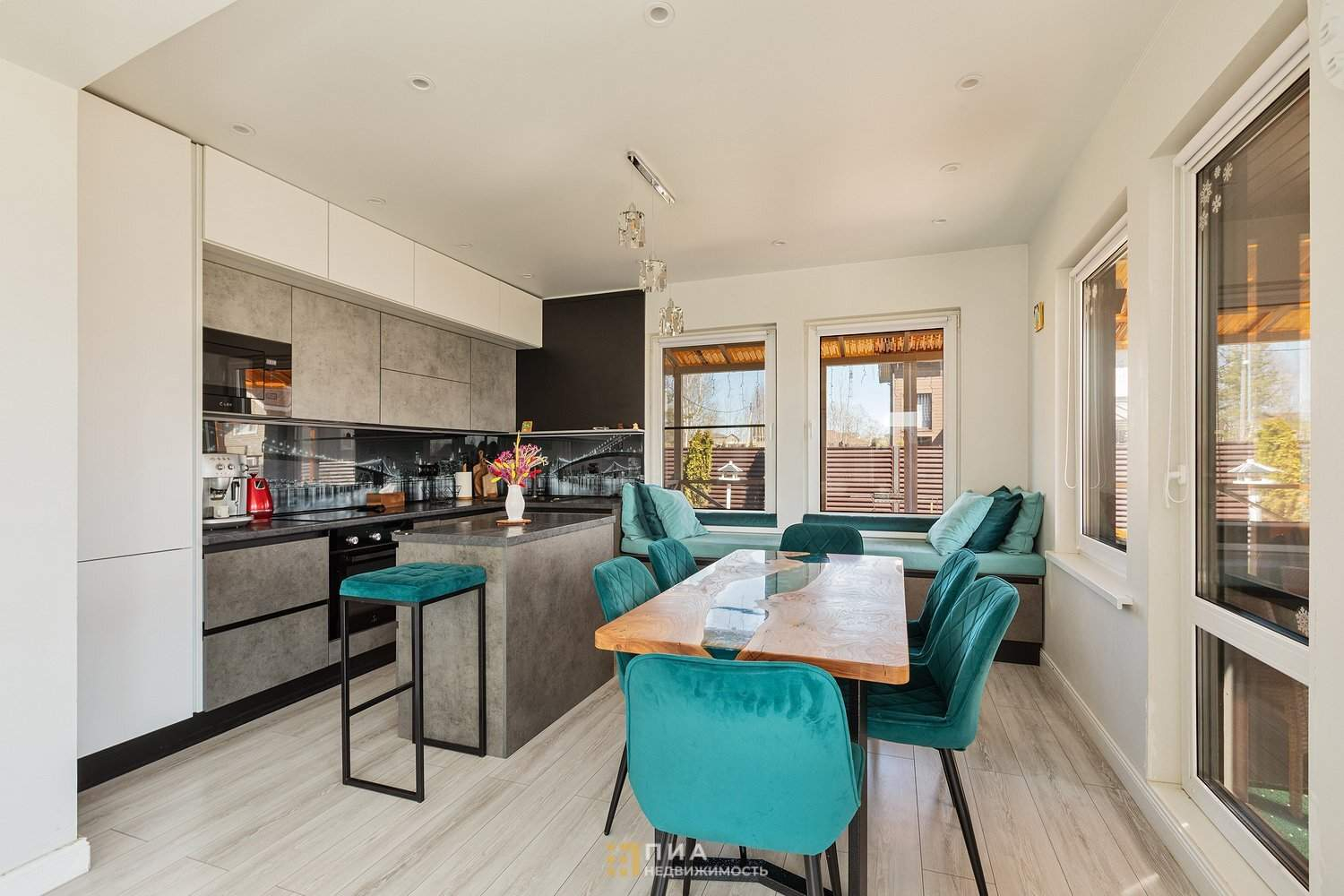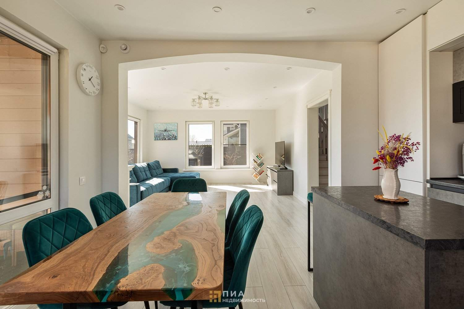 Просторная кухня - гостиная со встроенной техникой: холодильник, посудомоечная машина, индукционная плита, духовой шкаф, микроволновая печь, фильтр для питьевой воды. Отдельного внимания заслуживает стол из натурального дерева с эпоксидной смолой - центральный элемент интерьера.