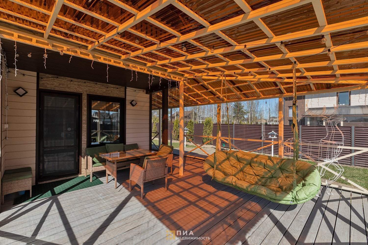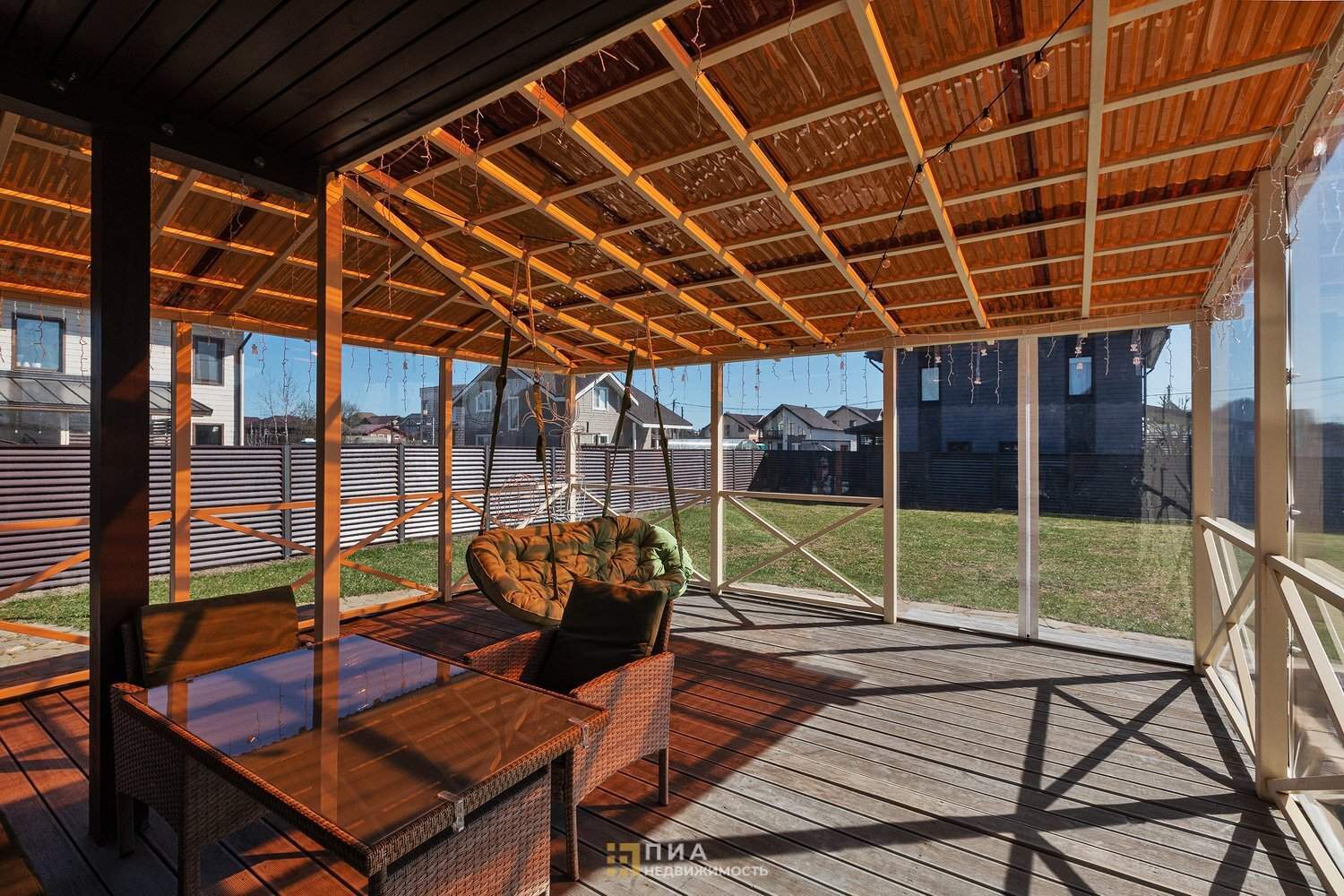 Терраса с качелями, садовой мебелью и мягкими окнами - зона отдыха, защищённая от ветра и дождя.