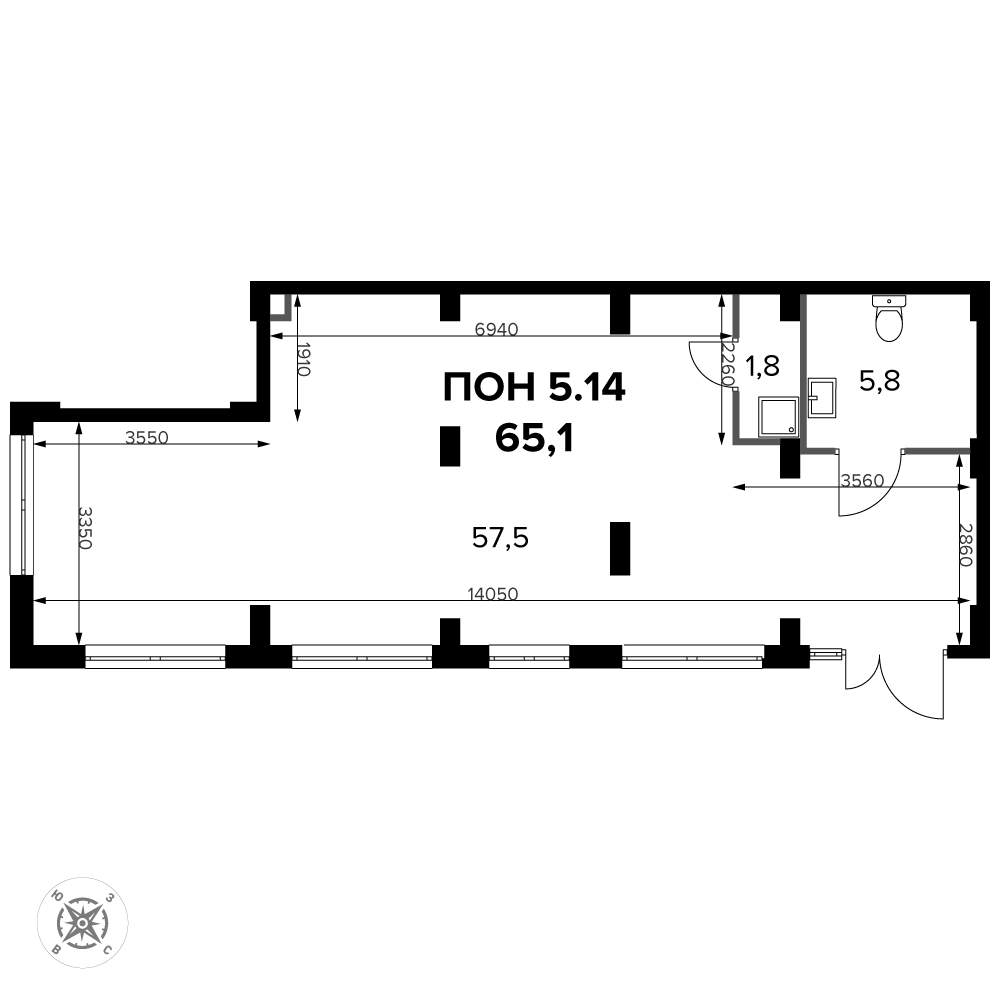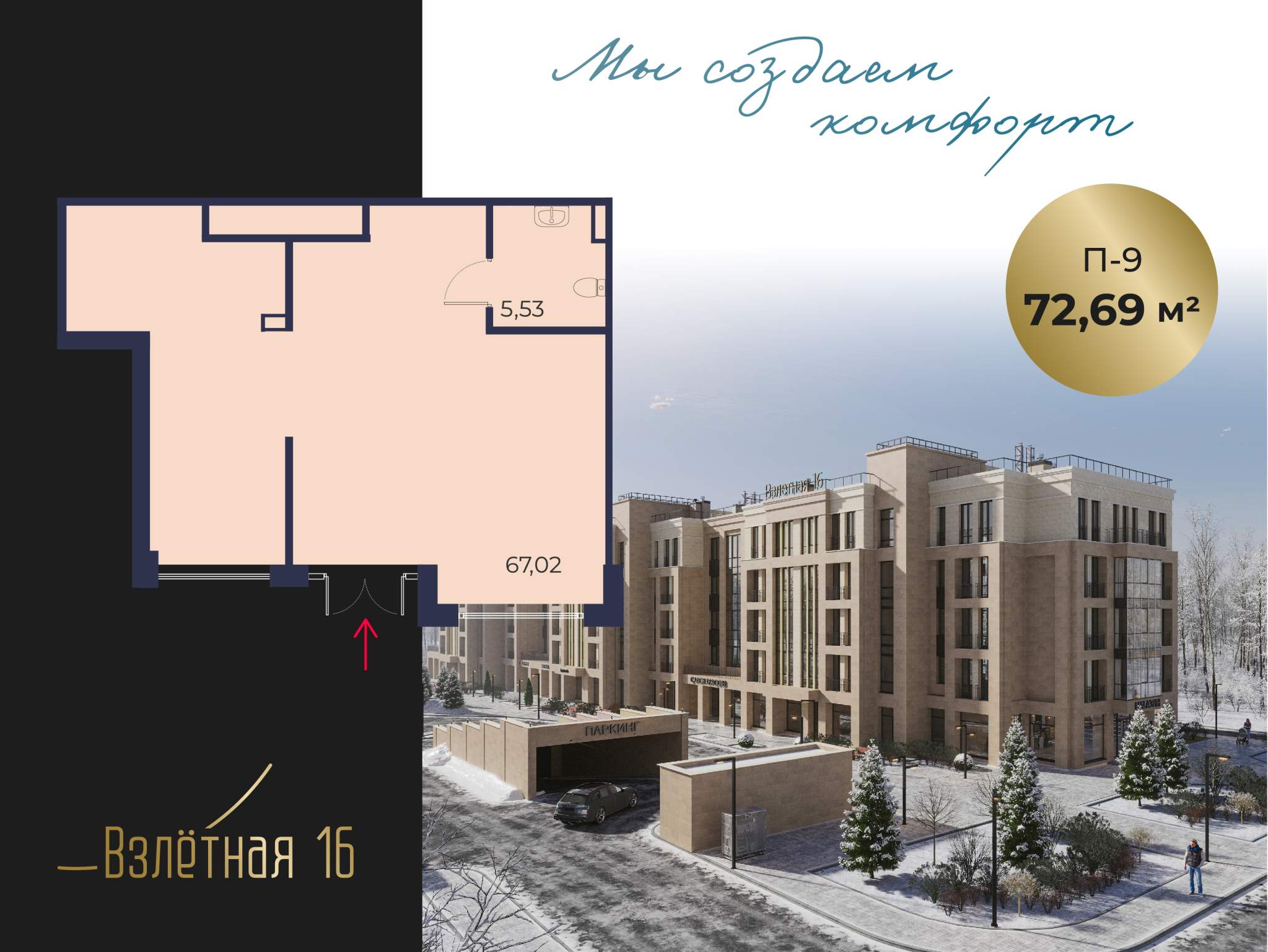 Продается от застройщика коммерческое помещение площадью 72,69 м2, в жилом комплексе бизнес-класса «Взлетная 16».