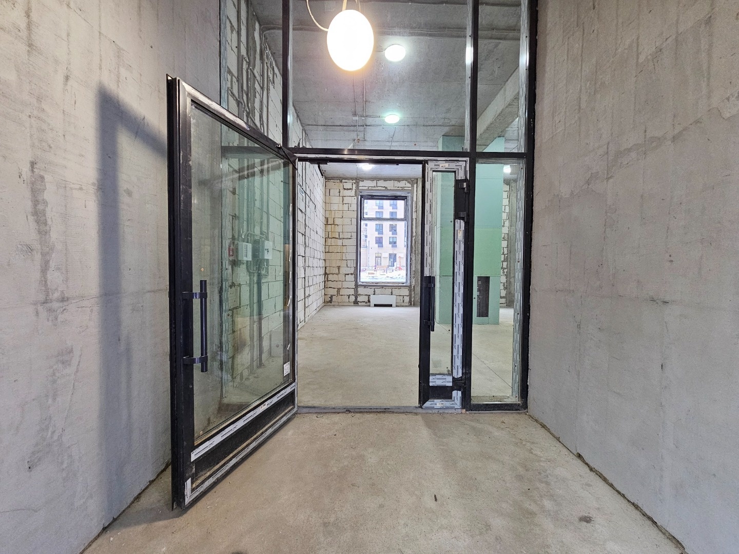 Отдельный вход с торца здания, хорошо просматривается с дороги.