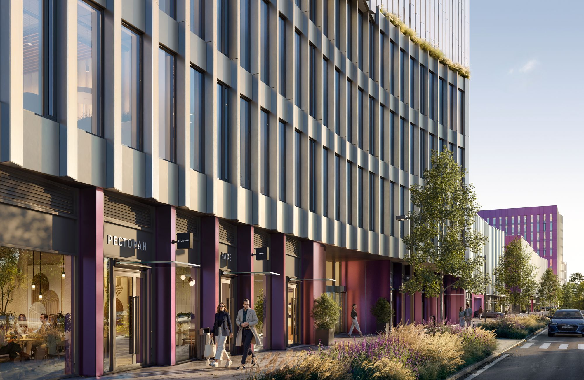 На территории формируется городская среда из современных жилых домов, общественных пространств, новых школ и детских садов, модных кафе и парков.