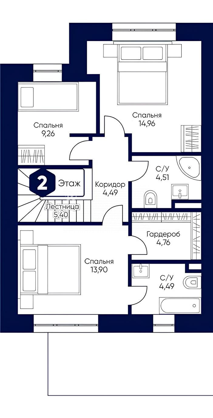 • На втором этаже таунхауса расположены две спальни, гардеробная и два санузла.