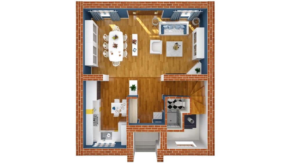 • На первом этаже таунхауса расположена просторная кухня-гостиная, площадью 40 кв.м. (кухня, столовая, диванная зона, камин), прихожая и хозяйственные помещения, терраса.