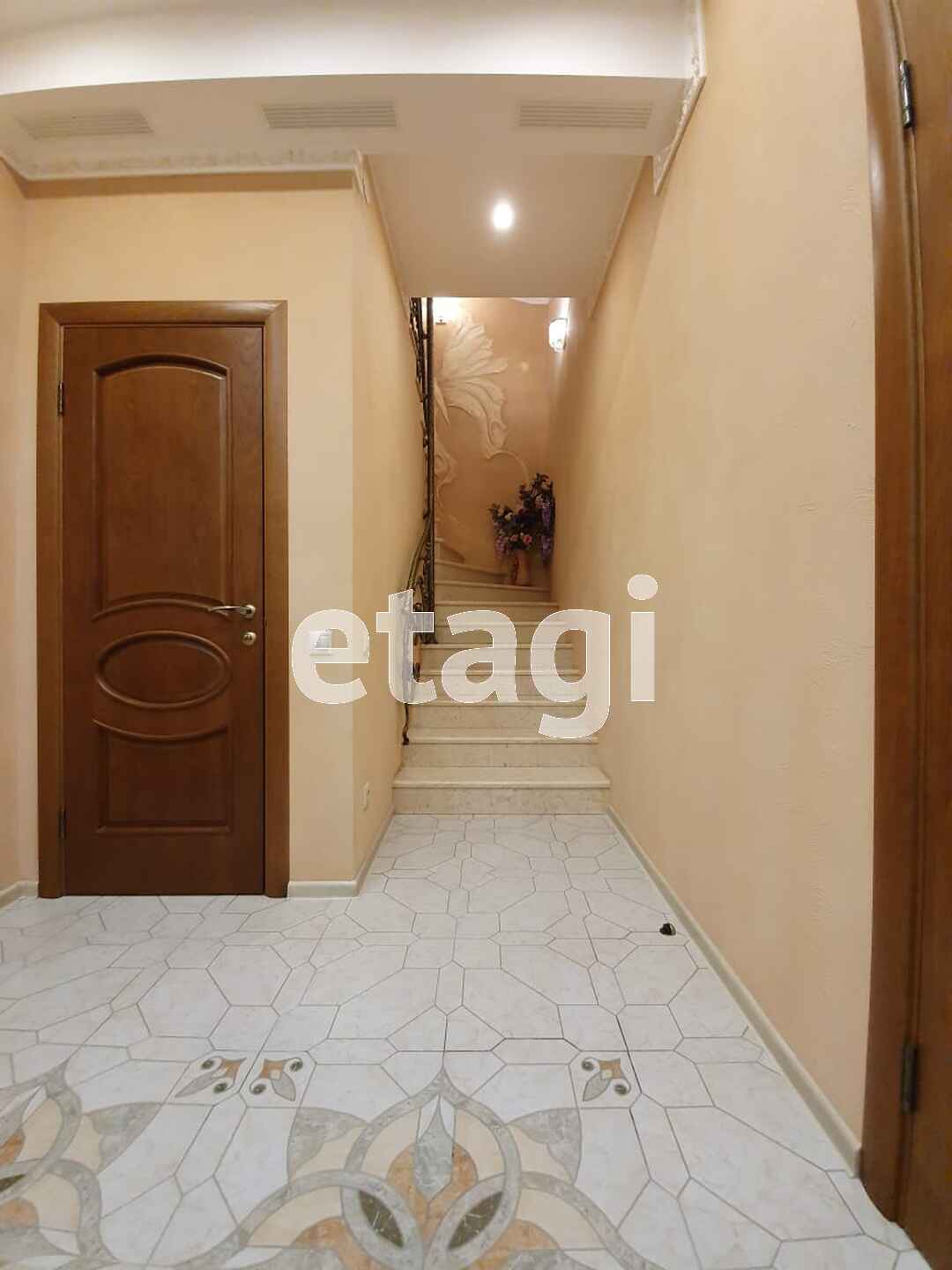 Лестница облицована мрамором, перила - ковка по индивидуальному заказу, итальянская штукатурка на стенах и декоративное панно ручной работы.