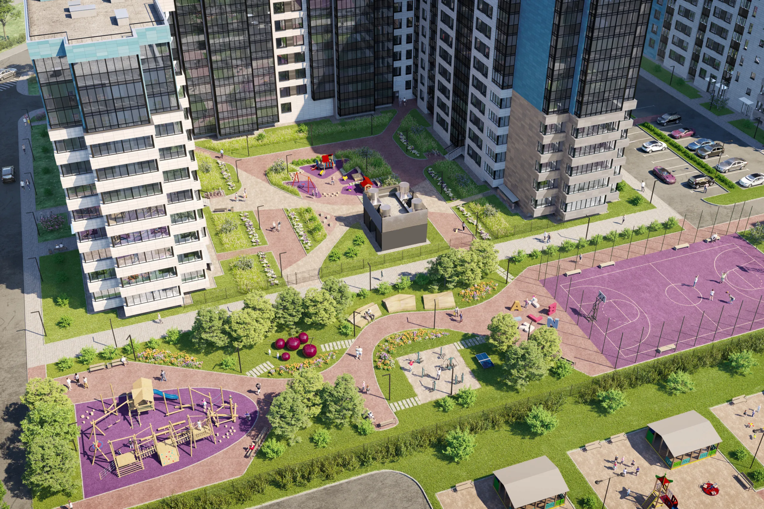 ТРК «Гулливер», магазины, гипермаркеты, рынок фермерских продуктов, аптеки, кафе, рестораны, кинотеатр – все есть рядом с домом. В квартале расположены несколько школ, в том числе с углубленным изучением английского языка, детских садов, творческих студий, а также три фитнес-клуба с бассейнами. Внутренняя инфраструктура представлена объектами стрит-ретейла на первых этажах, а также фитнес-клуб в здании апартаментов. Также будет построен детский сад с большим огороженным двором.