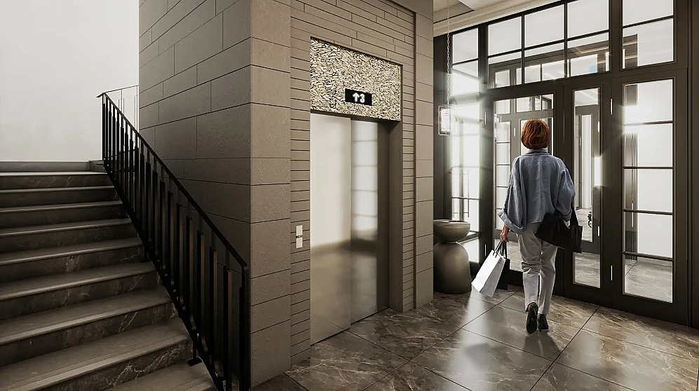 Парадный статус проекта раскрывается и в общественных пространствах. Характерные каждому стилистическому приему интерьеры входных групп перекликаются с линиями фасадных решений здания. Панорамное остекление, предельный функционализм и эффектные материалы подчеркивают торжественность и гостеприимство приема.